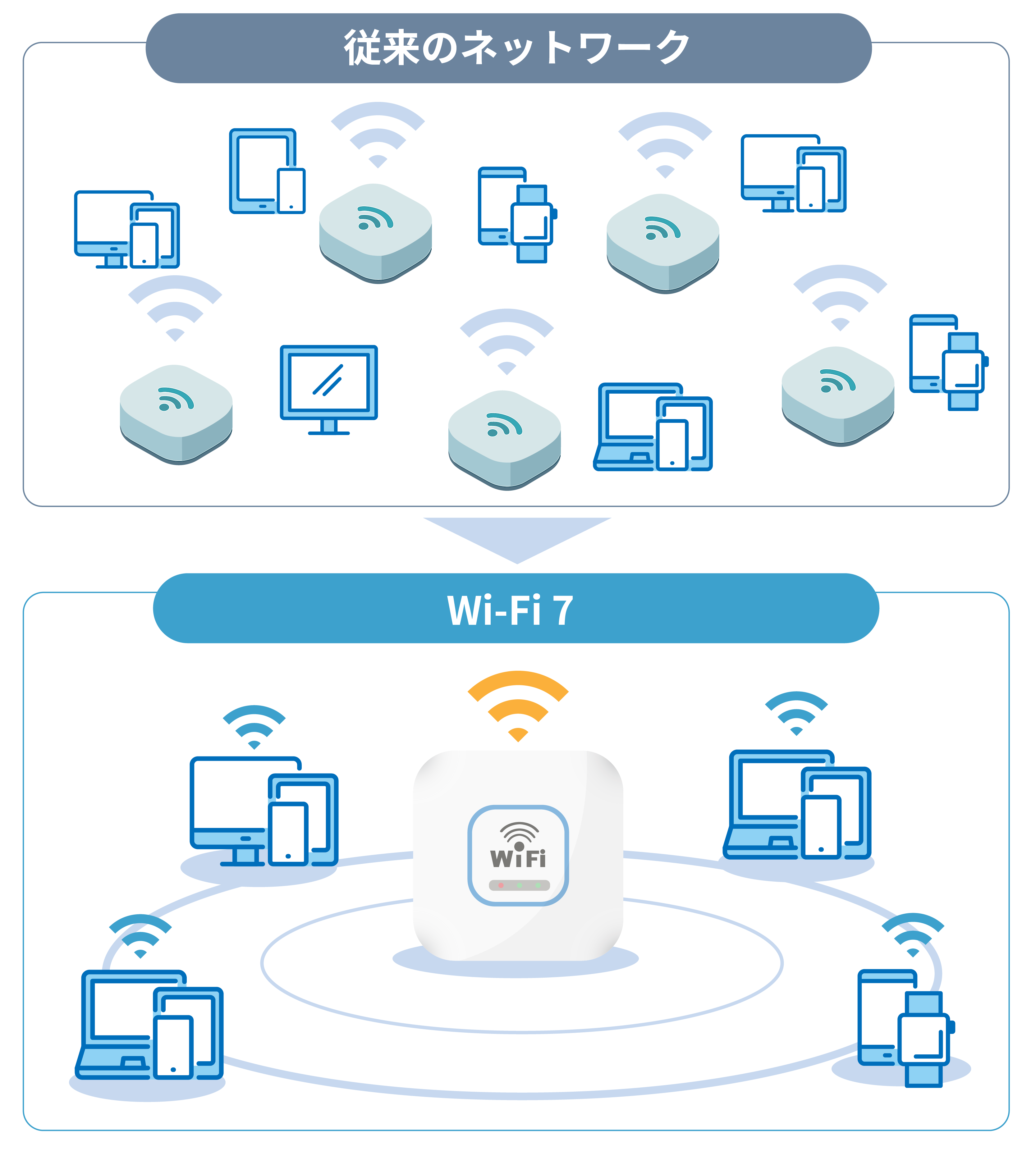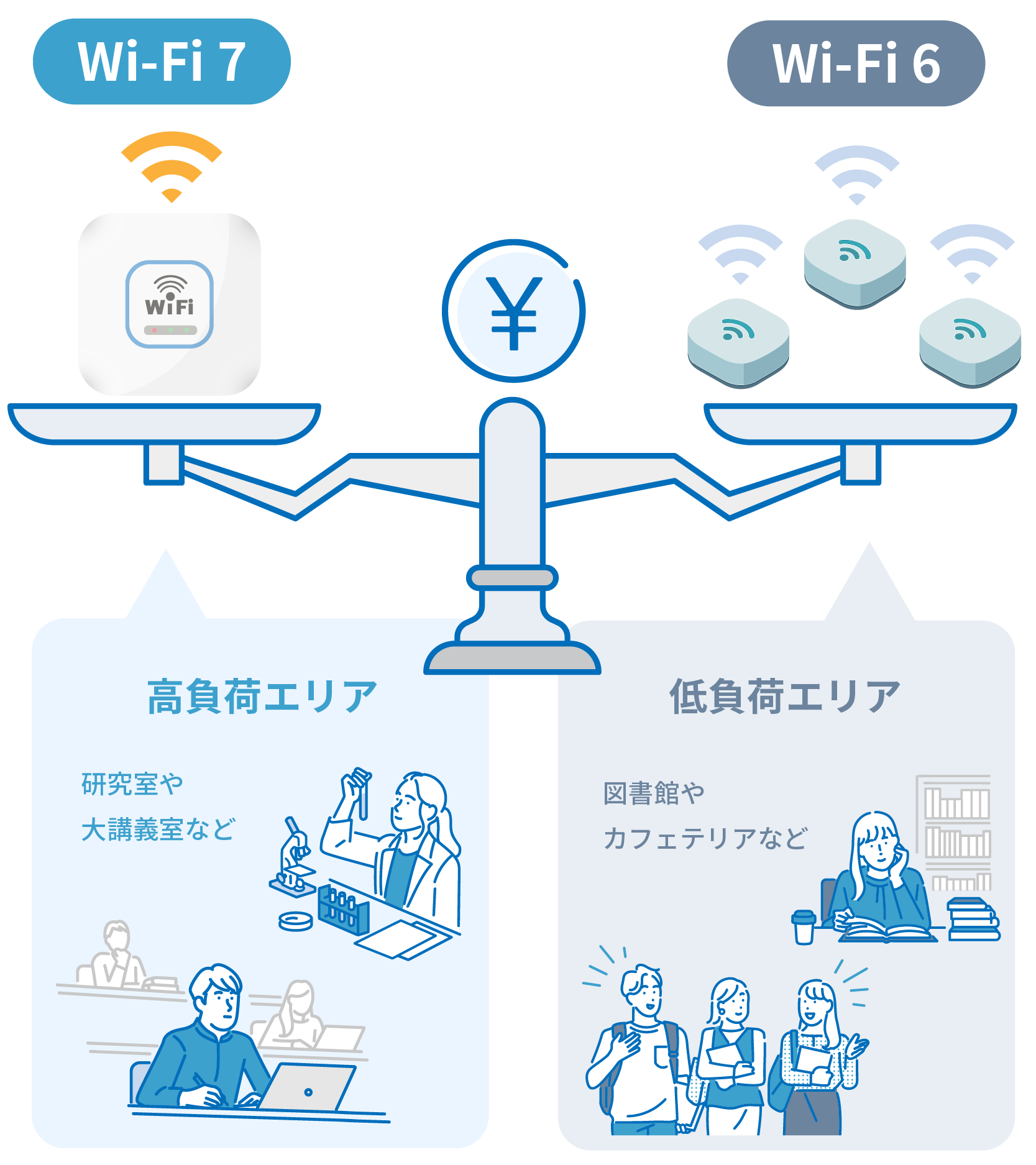Wi‑Fi 7は高性能な一方、全エリアへ一律導入するとコストが増大しがちです。そのため、同時接続数が多い場所にはWi‑Fi 7、負荷の小さいエリアにはWi‑Fi 6を組み合わせることで、通信品質と導入コストの最適化が可能です。