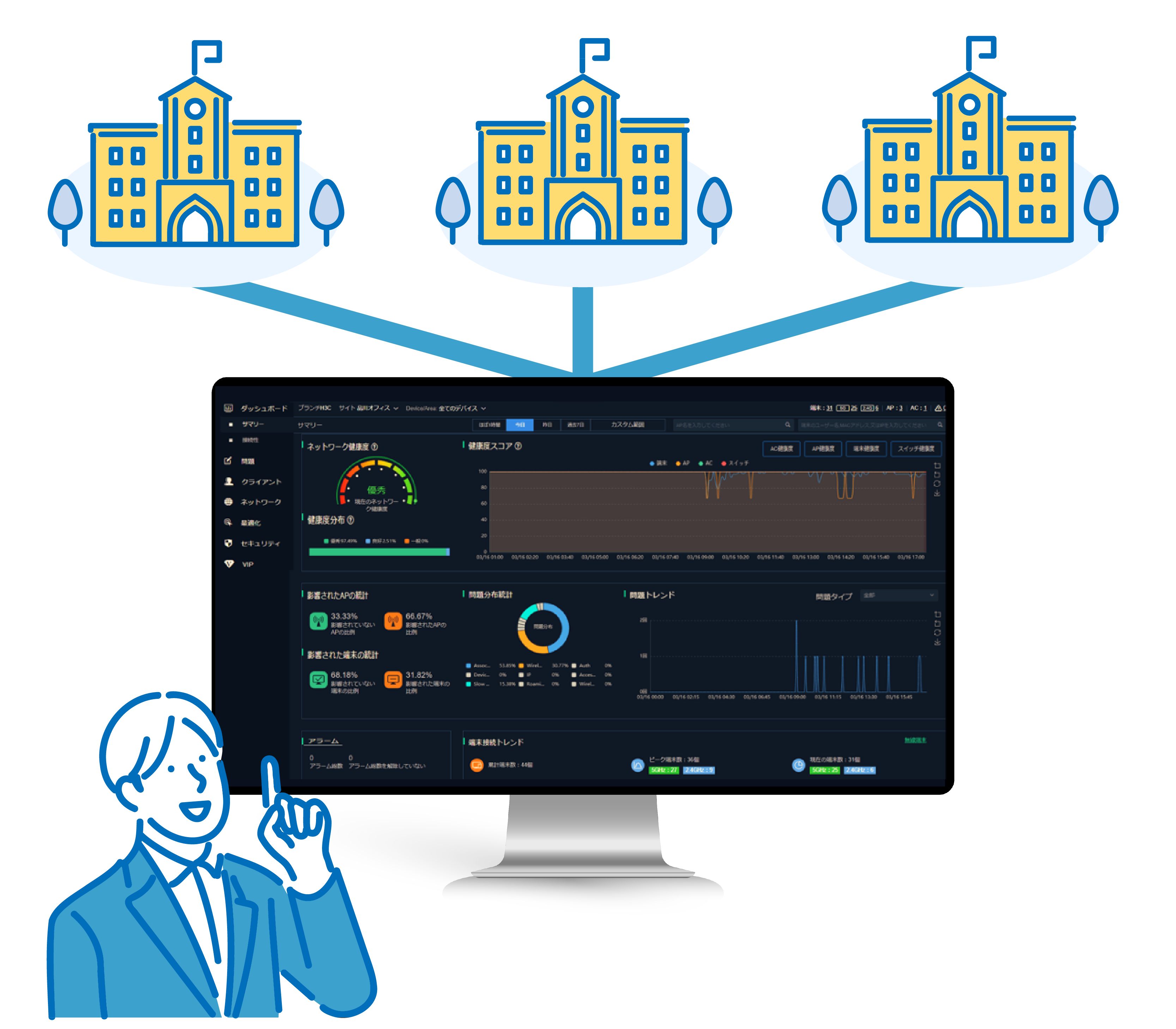 アクセスポイントやスイッチなどのネットワーク機器をクラウド上から一元管理し、キャンパス全体の通信状況を可視化。設定変更や状態確認、トラブルシューティングを効率的に実施できます。現地作業を最小限に抑えられることで、限られた運用人員でも安定したネットワーク運用が可能となり、日常の運用負荷やコストの削減に貢献します。
